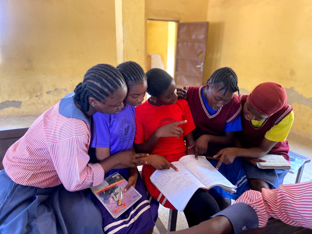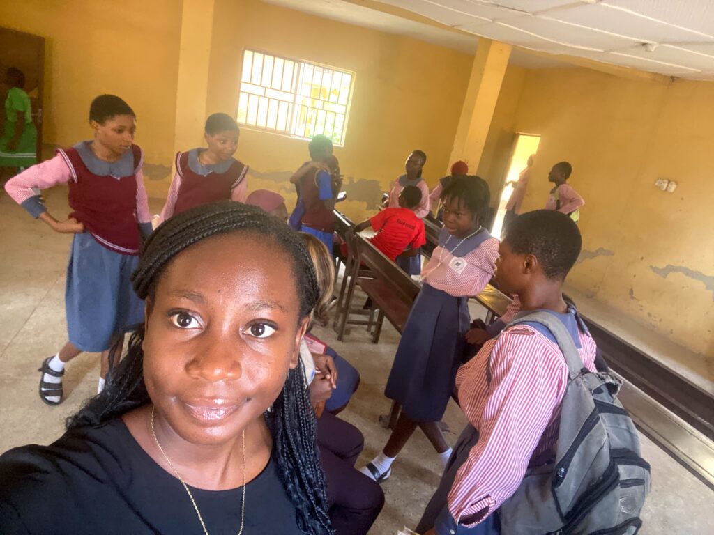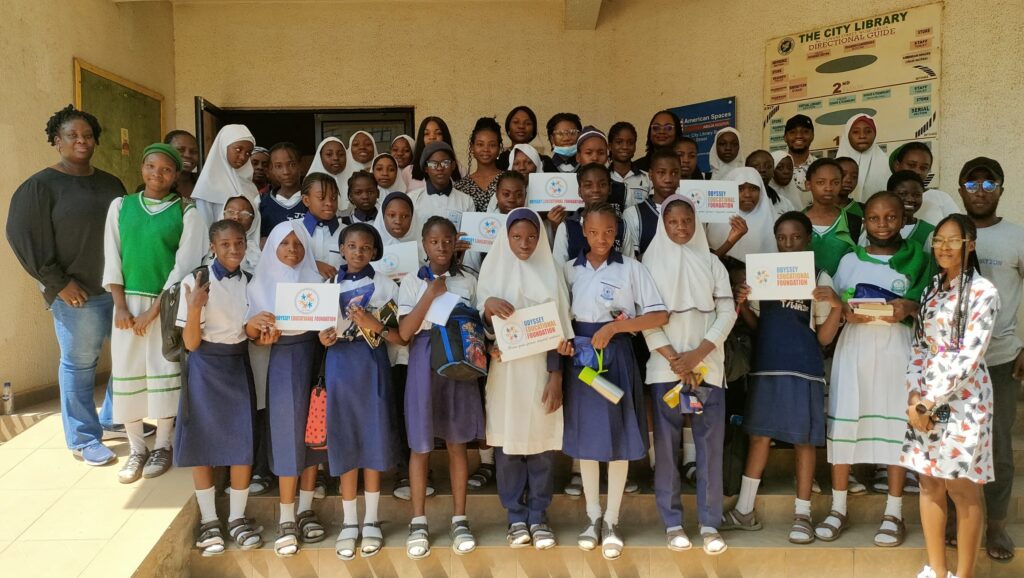 A candid, warm-lighting shot of the NGO’s team members and mentors standing in a semi-circle, smiling and chatting with a group of teenagers holding tablets and sketchpads. The background shows a banner with the NGO’s logo and the Nigerian flag.